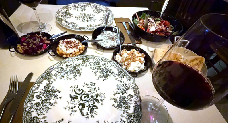 Teraz czas wyjaśnić, że owo tajemnicze meze, to zestaw kilkunastu małych talerzyków i miseczek, pełnych przystawek i dań głównych. W nich różne pasty, sałatki i kawałki mięsa pieczonego na grillu. Internety ostrzegają, że nie da się tego wszystkiego zjeść. Ja jednak wam mówię, że się da. Wystarczy nie mieć męża na diecie!